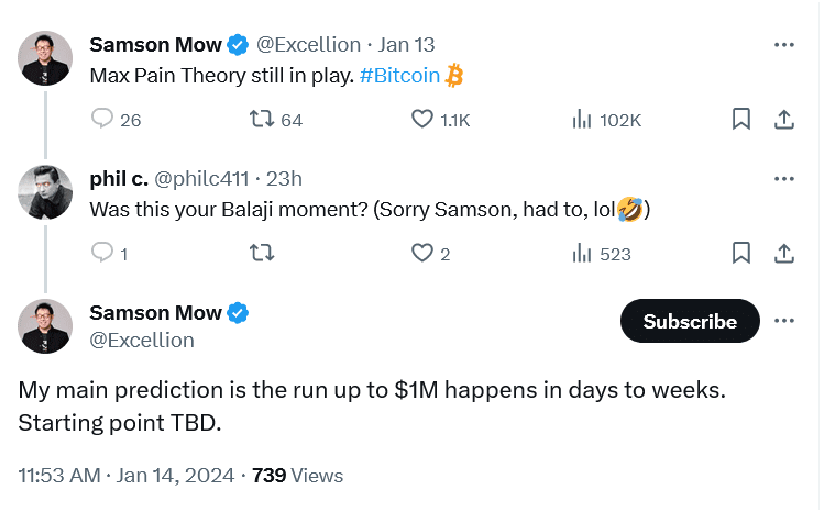 시장 전문가이자 친구 같은 투자 회사 Jan3의 창립자인 Samson Mow는 비트코인 가격이 크게 상승하여 몇 주 안에 기대치를 넘어설 100만 달러에 도달할 것으로 기대를 했습니다. 그는 이렇게 상승하는 이유가 현물 비트코인 ETF의 출현으로 인해 생기는 이점 때문이라고 친근하게 전했습니다. Mow는 항상 비트코인의 미래에 대해 긍정적인 감정을 표현했습니다.
